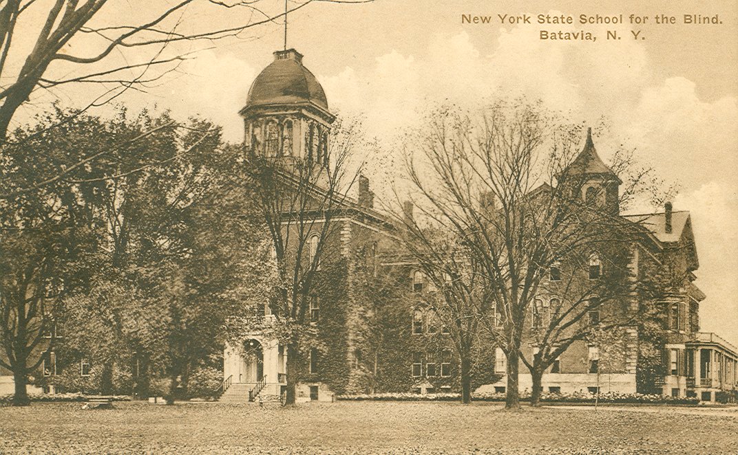 - Sepia-toned photo; partial view of front entrance and attached wing; multistoried building with a cupola over the entrance; covered portico has arched entry; view obscured by trees. Printed at top right corner is "New York State School for the Blind. Batavia, N. Y." Back is divided and unused. "Post Cards of Quality.--The Albertype Co., Brooklyn, N.Y." is printed vertically along the center. "Published by Hotel Richmond, Batavia, N. Y." is printed along the left edge.